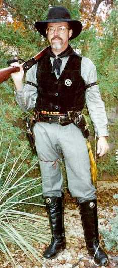 Here's the details, starting with the boots. These were well-used Cavalry boots bought from a friend for $50. Another $35 to replace the worn out heels, then $5 for a pair of conchos to spiff them up. They were a little large for my feet but perfect when I put a foam insert in the bottom and wore two pair of socks, and all that added padding helped with being on my feet all day. The pants are a wool pair of dress pants from the Goodwill that had a subtle stripe thing happening. These already had suspender buttons. I think I paid $6 for them. The gray banded color shirt and the suspenders (which can't be seen) were given to me by a brother. But lets say you don't have a generous brother. I've bought several banded color shirts at Goodwill for $6. And sure, a shirt with a collar would be fine, too. Both would be period correct, although it wouldn't matter if they weren't. Both are definitely silver screen correct. A shirt pocket might not be period correct either, but you can't tell if it is under a vest and I like to use them for sunglasses, pen, etc. You can spend $15 on a decent but inexpensive pair of suspenders. I've found a goodly variety of them cheap on E-bay, as little as $5 each (plus shipping, of course). The black suede vest I must admit was found on sale in the women's department at K-Mart. $6. Fits good. I made the arm garters from a short piece of black elastic with some little decorative metal stud thingies from the craft store attached. The bandana was $1 from the craft store. The scarf slide is just a favorite ring of mine. The hat, another item that can set you back a bunch, was free. It is a cheap felt hat my mom found in the attic. If I had to buy one like that at a second hand store, I can't imagine it being more than $5 or $10. Don't let the clothes nazis give you a hard time for wearing a hat with less than ten X's on it. Sure I'd like a high quality hat, and one day I'll have one (when I can find a used one for a bargain, heheh). My most expensive hat now is a 4X Resistol that I got on clearance at Shepler's for $50.